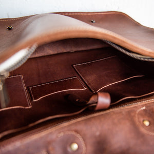 This is truly a “ONE OF A KIND” messenger bag, quickly converting from a traditional carry to a backpack carry.  It is made of Full Grain American leather in our Huntsville, Alabama shop.  It measures 17 x 4.25 x 12.5, affording plenty of room for all your essentials.  I personally carry 2 laptops, large leather journal, power cords, pens, and various other must-haves.  Solid Brass Hardware.
