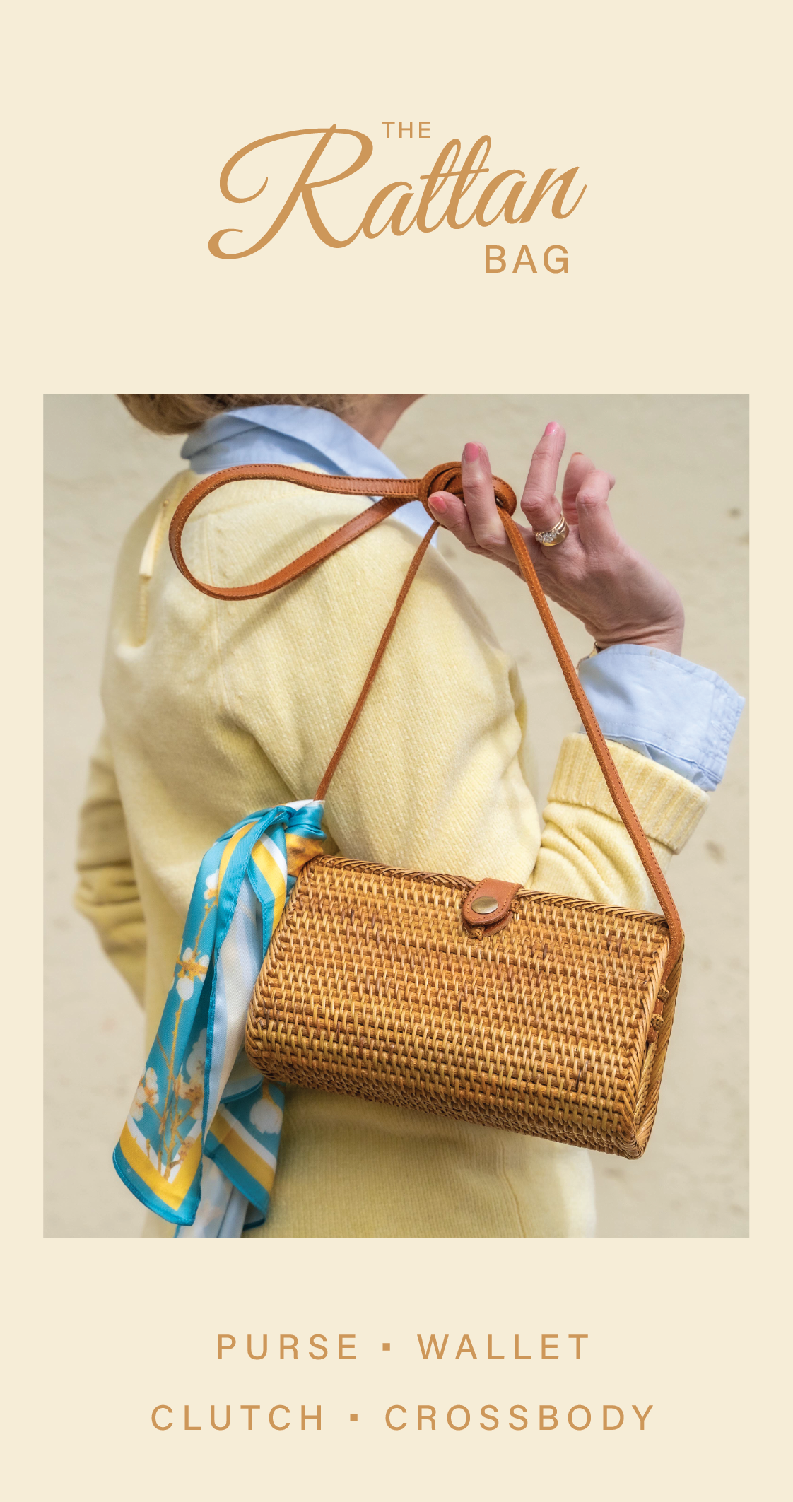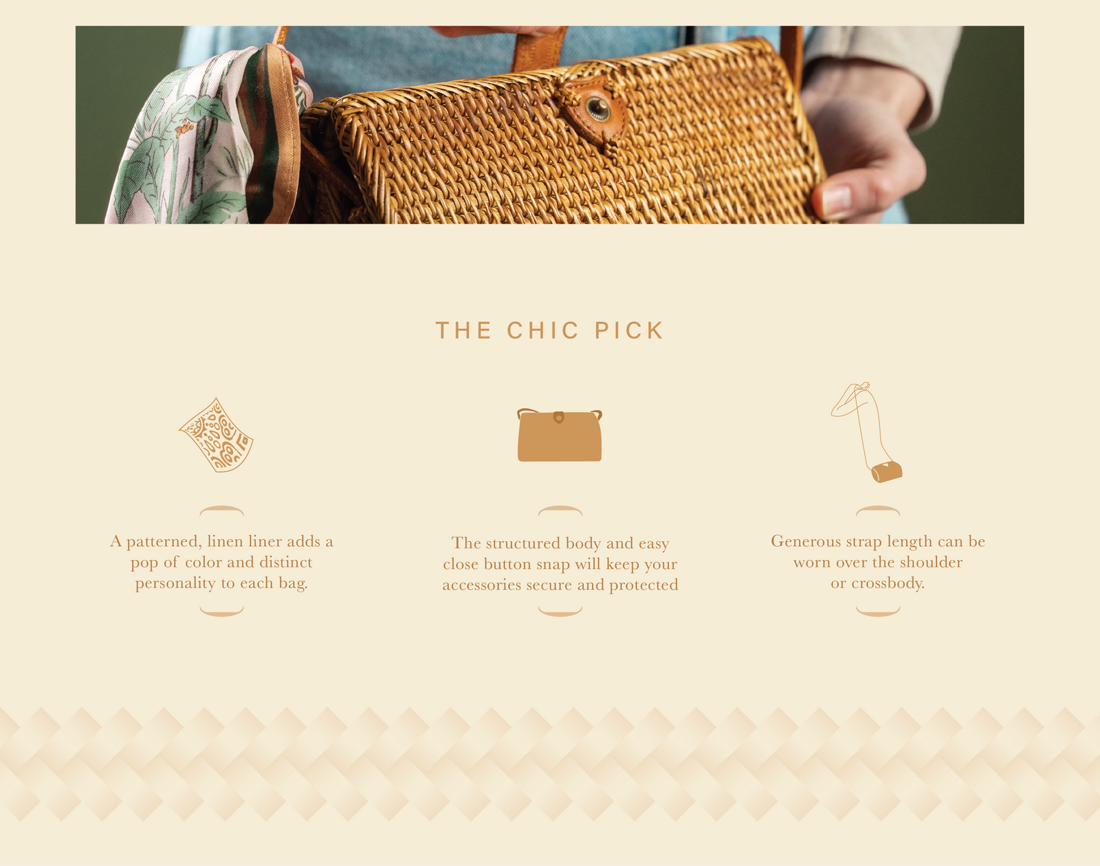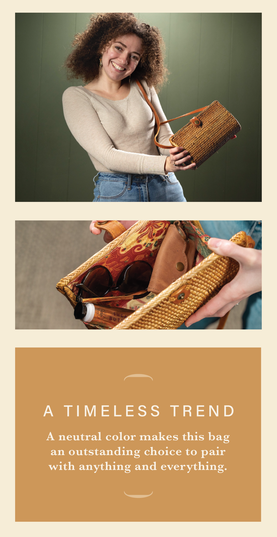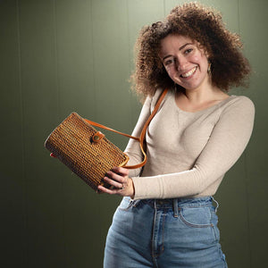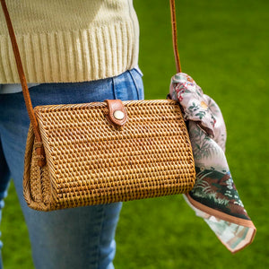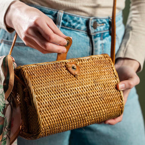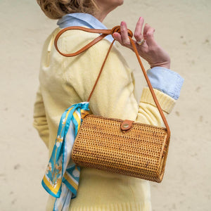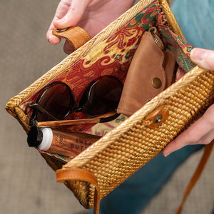 Your new spring crossbody purse is here! Handwoven rattan has a timeless appeal, and the addition of a batik linen liner adds a touch of artistry. The structured design is not only fashionable, but practical for keeping your belongings organized and secure. Each carefully woven bag tells a story while going through the process of hand weaving and drying to arrive at its final color.
