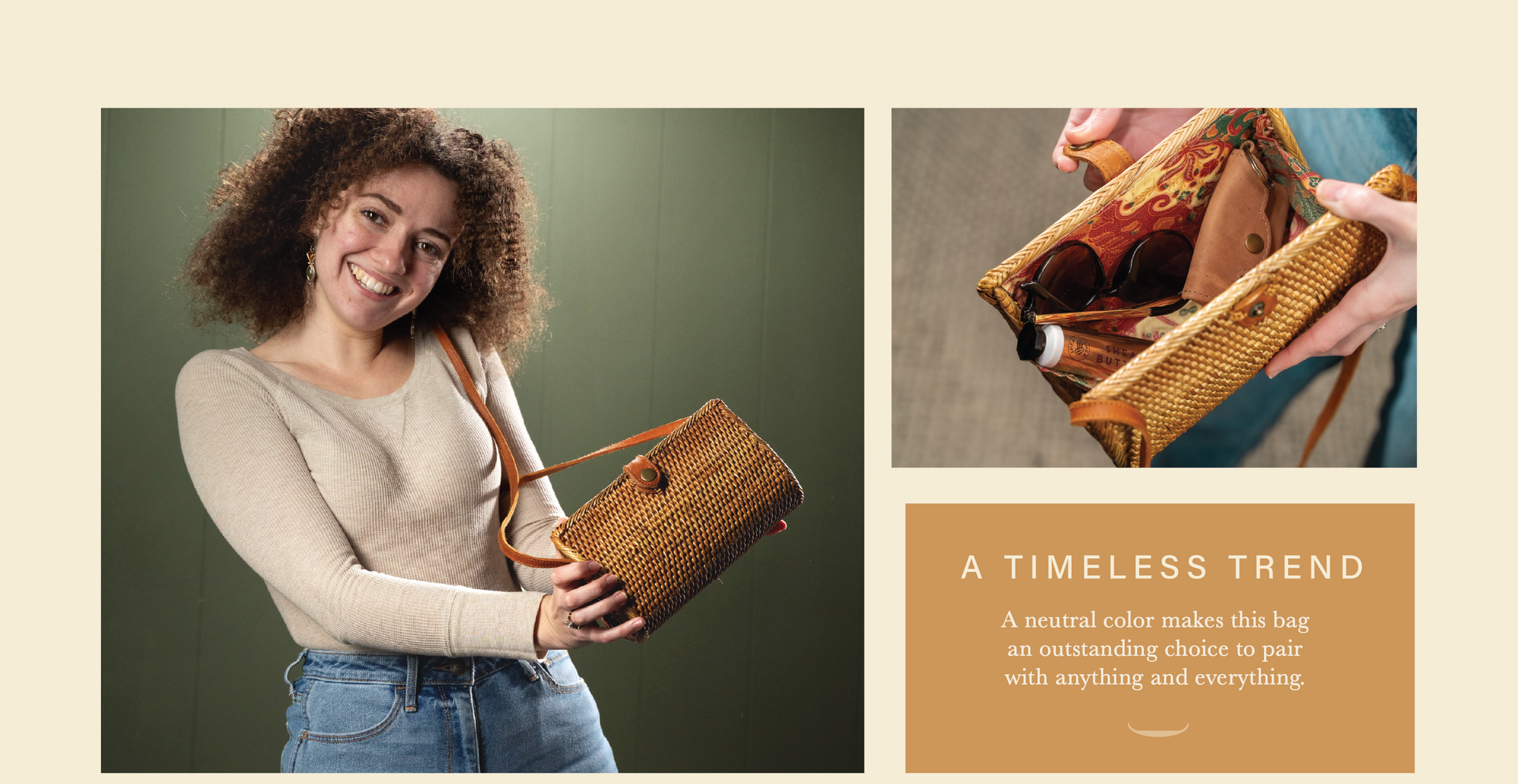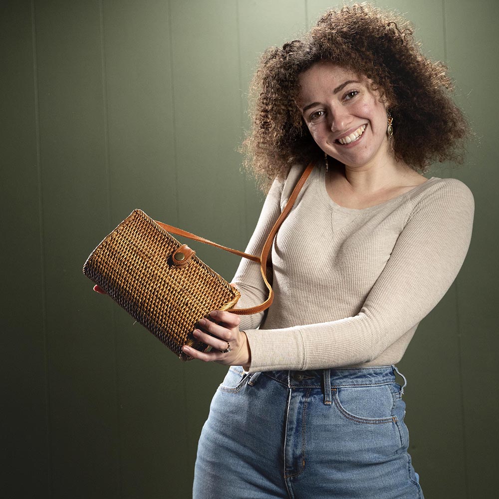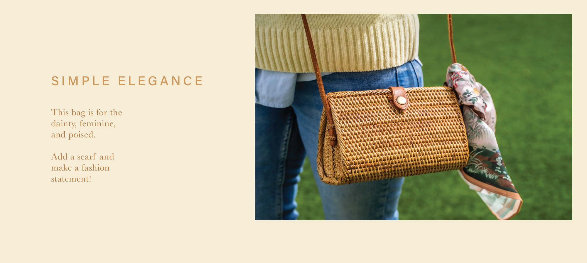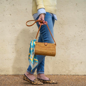Your new spring crossbody purse is here! Handwoven rattan has a timeless appeal, and the addition of a batik linen liner adds a touch of artistry. The structured design is not only fashionable, but practical for keeping your belongings organized and secure. Each carefully woven bag tells a story while going through the process of hand weaving and drying to arrive at its final color.