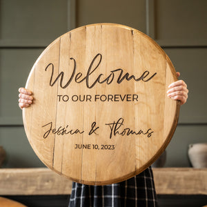 Welcome To Our Forever - Personalized Whiskey Barrel Wedding Welcome Sign