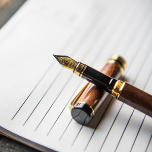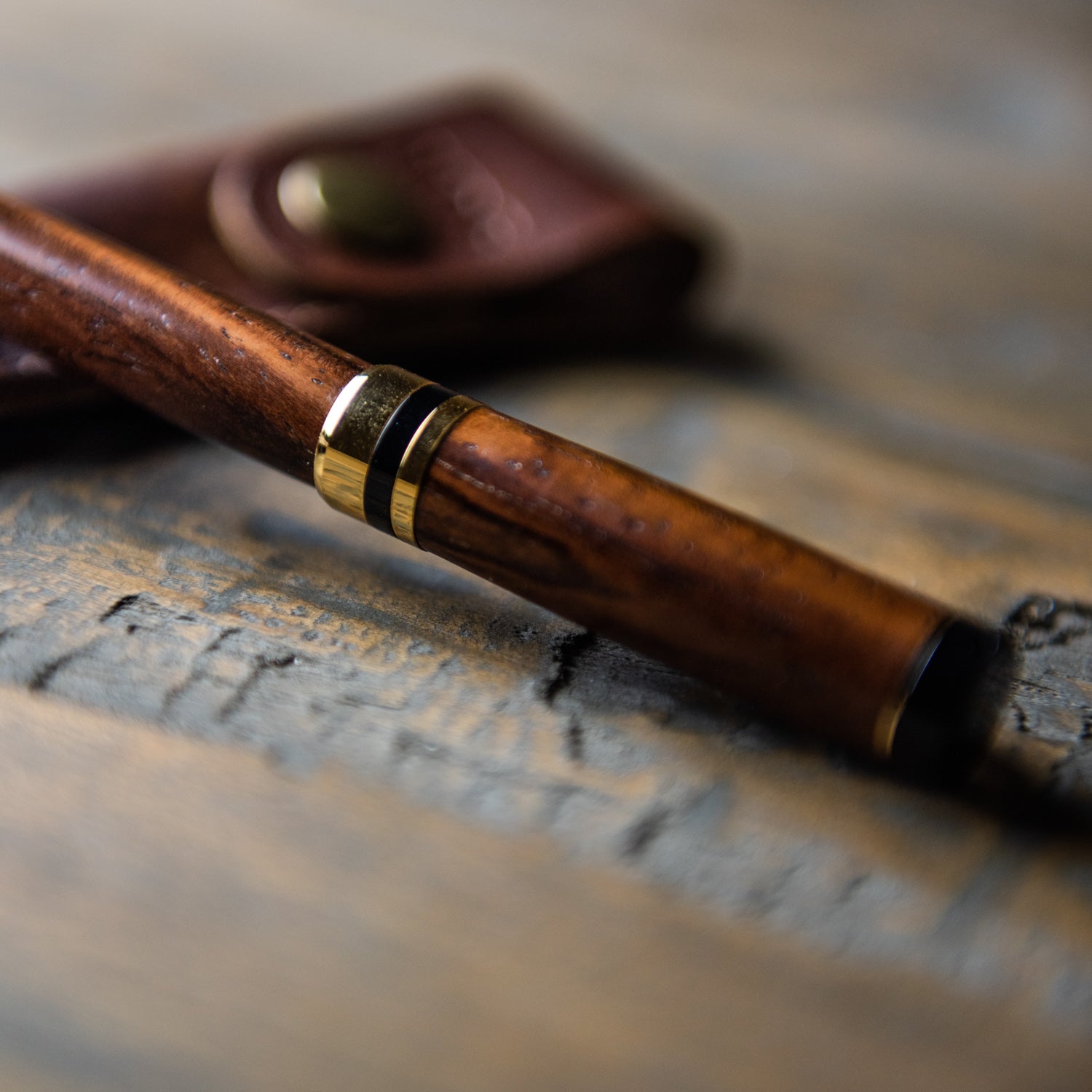 This rosewood fountain pen is hand-turned in Huntsville, Alabama. It comes with a leather case that can be personalized with initials.