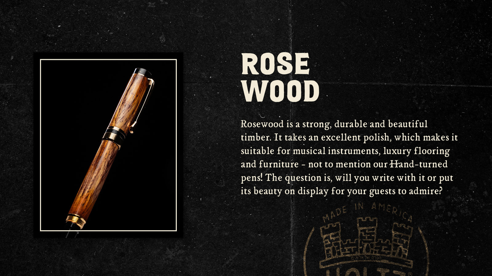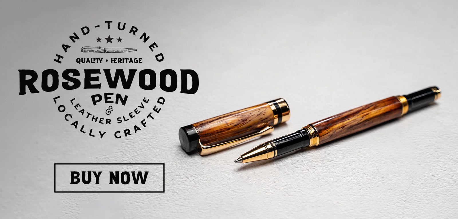 This comfort style pen is hand-turned from rosewood for a smooth stroke. With either Antique Brass or Gun Metal hardware and a twist-action mechanism to make any signature special. Hold onto this pen; it's not one you'll want to let go. We make these pens in Huntsville, Alabama, USA.