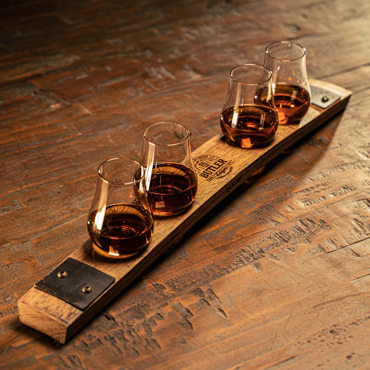 Ideal for whiskey enthusiasts and collectors, this flight not only serves as a functional piece for sampling spirits but also as a decorative accent that adds rustic charm to any space. Whether displayed on a bar cart, countertop, or shelf, it becomes a focal point that sparks conversations and creates a cozy atmosphere for hosting friends and family.
