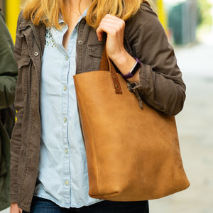 The Ashley Tote is a simply classy catch-all. Its easygoing design and rustic style is sure to make it your go-to tote. With a roomy main compartment and quick-access interior pocket (for your phone or keys!), this tote doesn't sacrifice on function or style. Made from Full Grain American Leather, the Ashley will stand up to years of use (and love!). Choose from any of our beautiful colors - brown, black, or tan - and personalize it with your logo or name to make it uniquely yours!