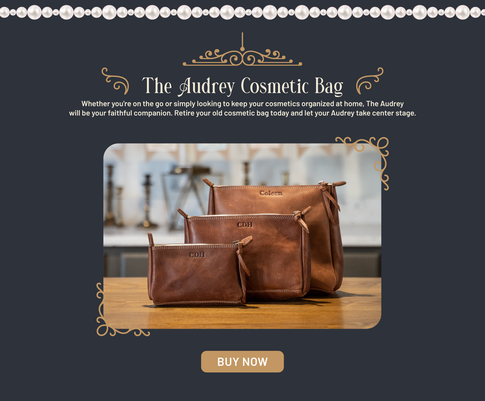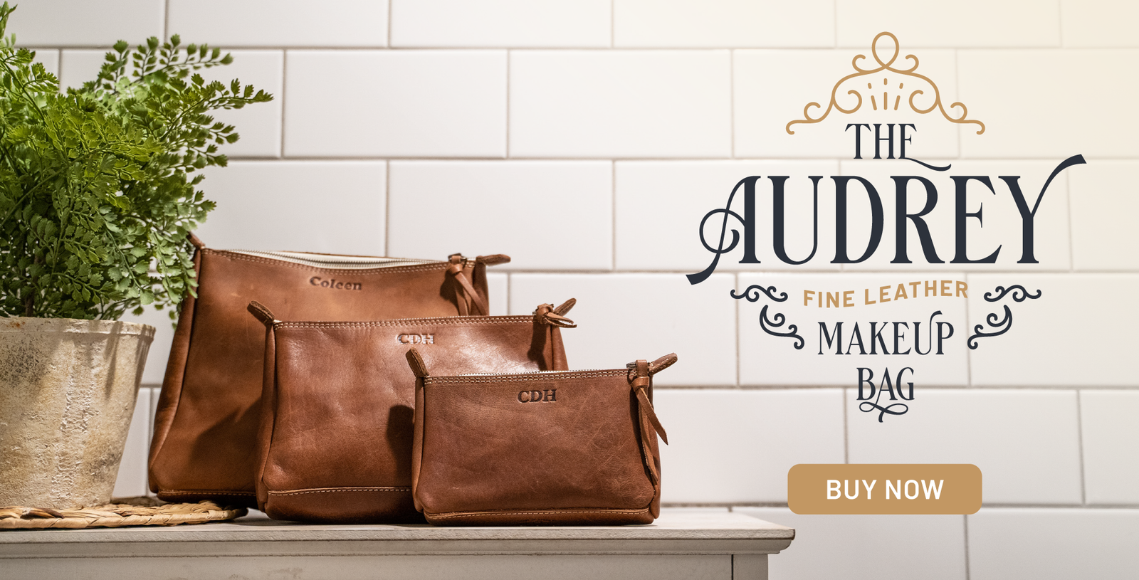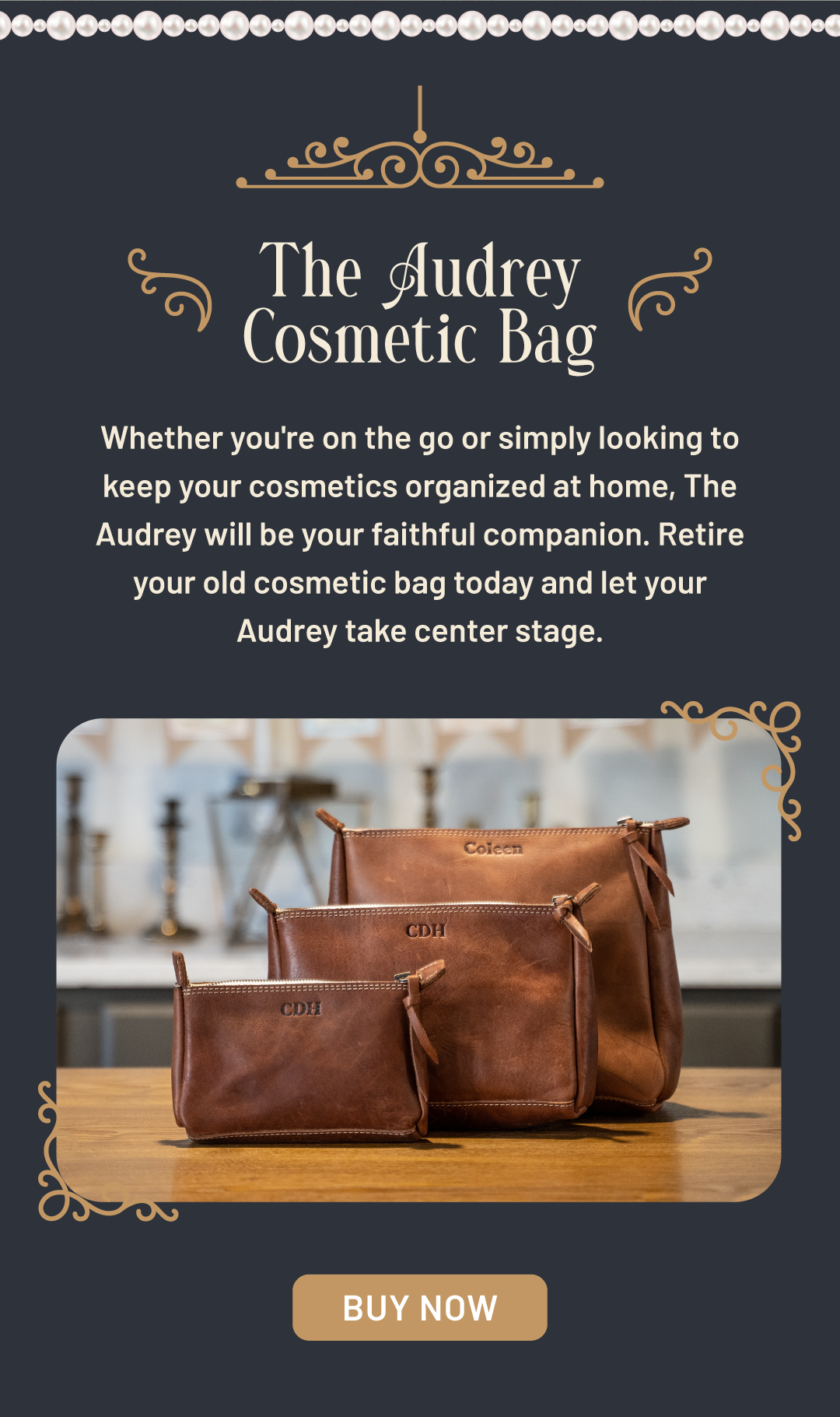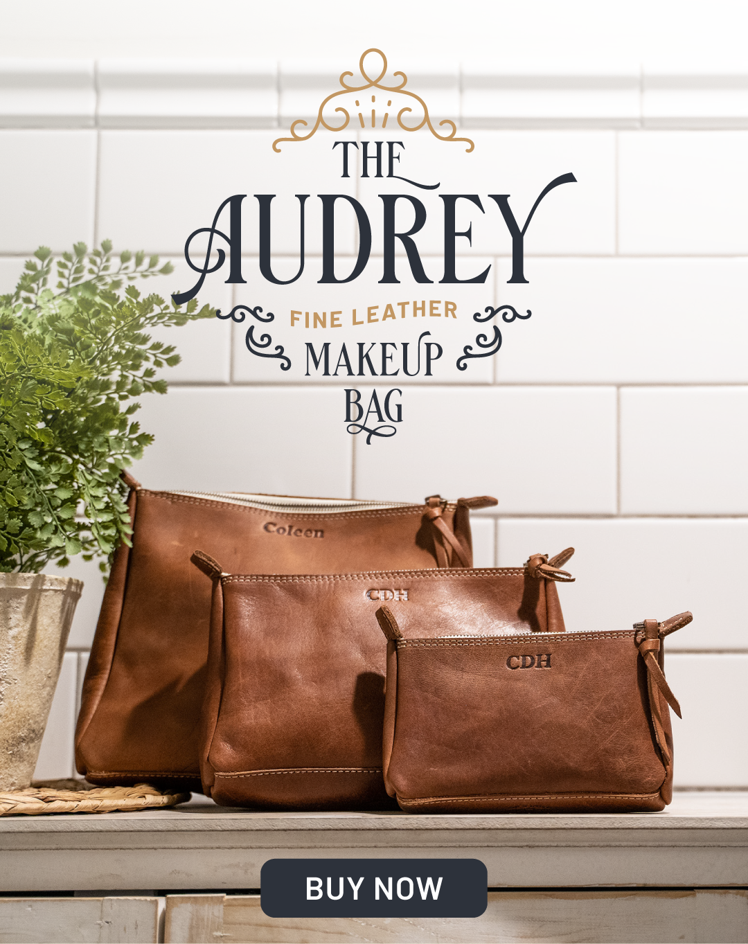 The Audrey Fine Leather Cosmetic Bag is a masterpiece in the world of beauty and organization. With three sizes to choose from, the Audrey is designed to cater to your every need. Whether you're on the go or simply looking to keep your cosmetics organized at home, the Audrey will be your faithful companion. So retire your old cosmetic bag today and let the Audrey take center stage!