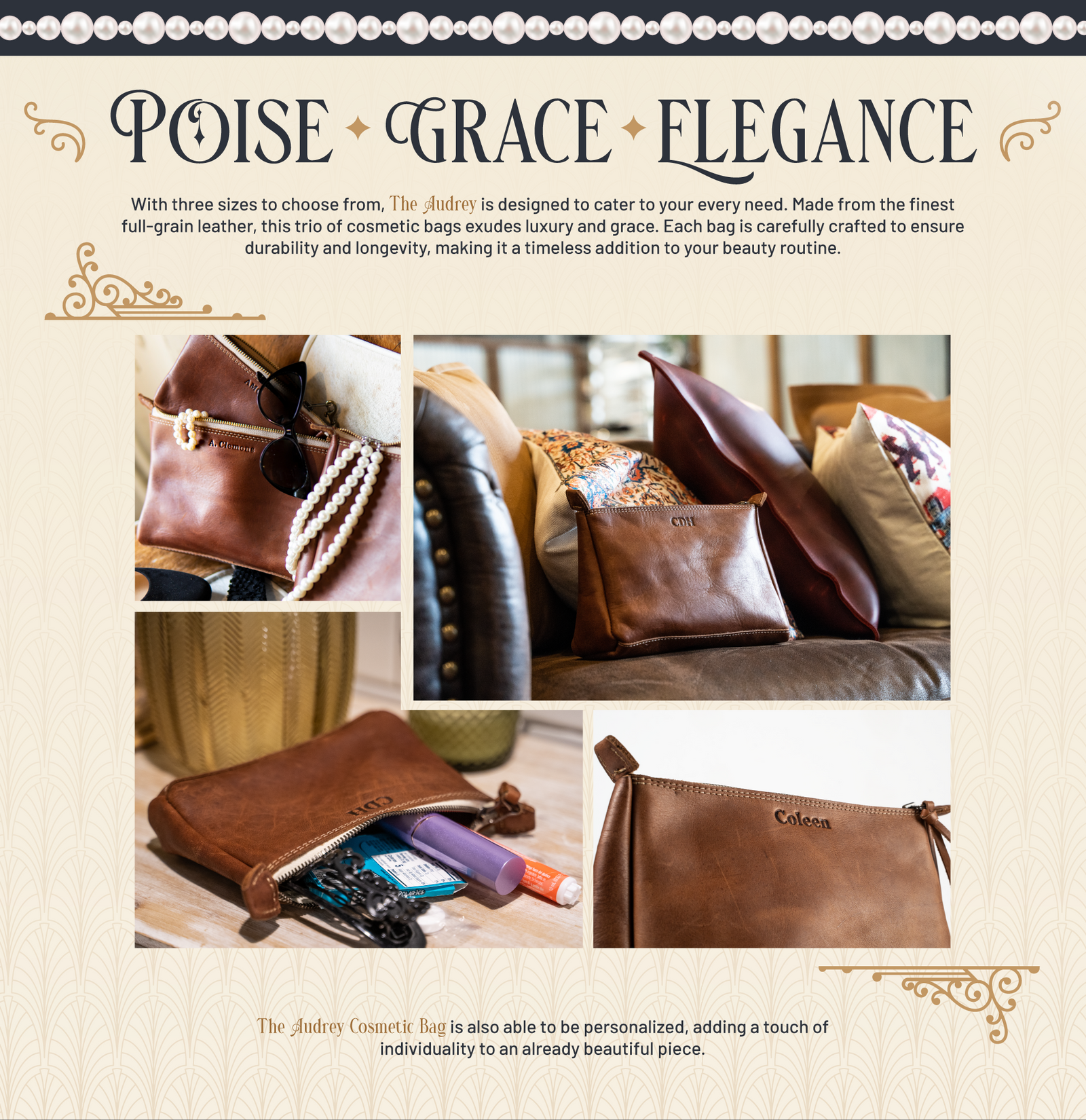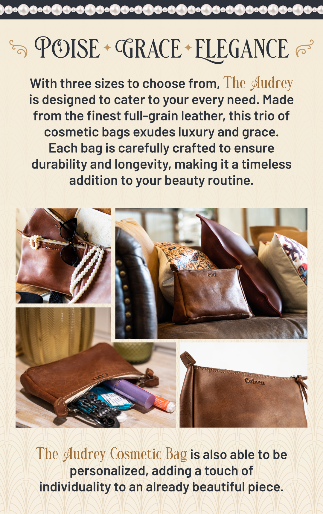 The Audrey Cosmetic Bag is also able to be personalized, adding a touch of individuality to this already extraordinary piece.